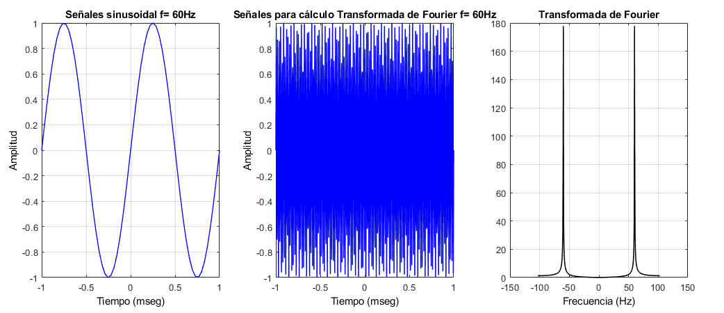 Los resultados del código muestran dos señales: una en el dominio del tiempo a la frecuencia de 60Hz (izquierda) y su correspondiente en el dominio de la frecuencia que es el resultado de la transformada de Fourier (derecha), para aproximar la TF a lo que sucede en la realidad se presenta en la imagen el valor absoluto, además, observe que la frecuencia de las señales está en 60Hz positivo y 60 Hz negativo, en la realidad esto no es cierto, no existen frecuencias negativas pero el modelo matemático si las calcula.