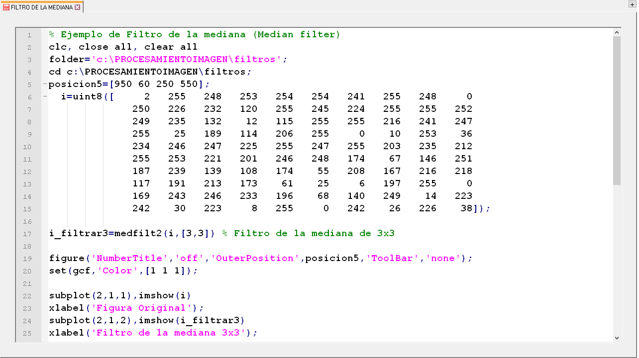 El código permite comprobar el funcionamiento de la función del filtro de la mediana utilizado en Matlab.