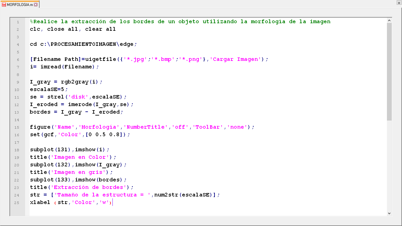 En la figura se observa el código para usar la operación morfológica de erosión, para definir los bordes de los objetos en las imágenes y poderlos identificar con algoritmos más sofisticados de visión artificial.