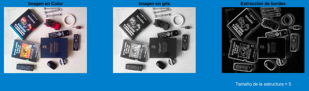 En las figuras del centro y derecha se observa el resultado obtenido con el código que aplica el algoritmo para extraer los bordes de los objetos, se utilizan los conceptos de erosión, elemento estructurante y su tamaño. En la figura de la izquierda se observa la extracción de los bordes de la imagen a color RGB.
