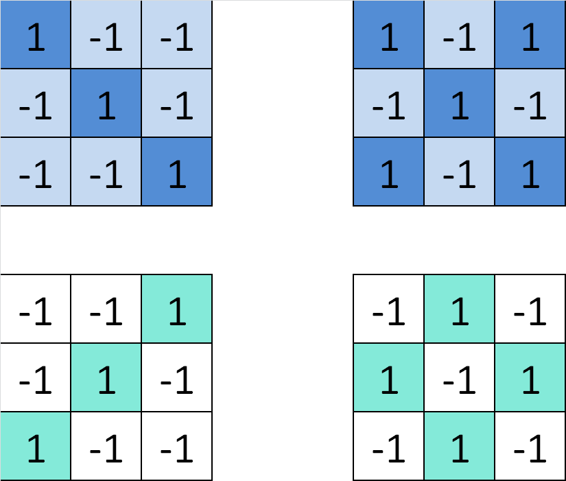 Para comprender cómo funciona las RCN es esencial operar las diferentes matrices y operaciones que se necesitan para realizar la convolución en las imágenes. Obtener las matrices de la capa de convolución para los siguientes filtros de la letra “X”.