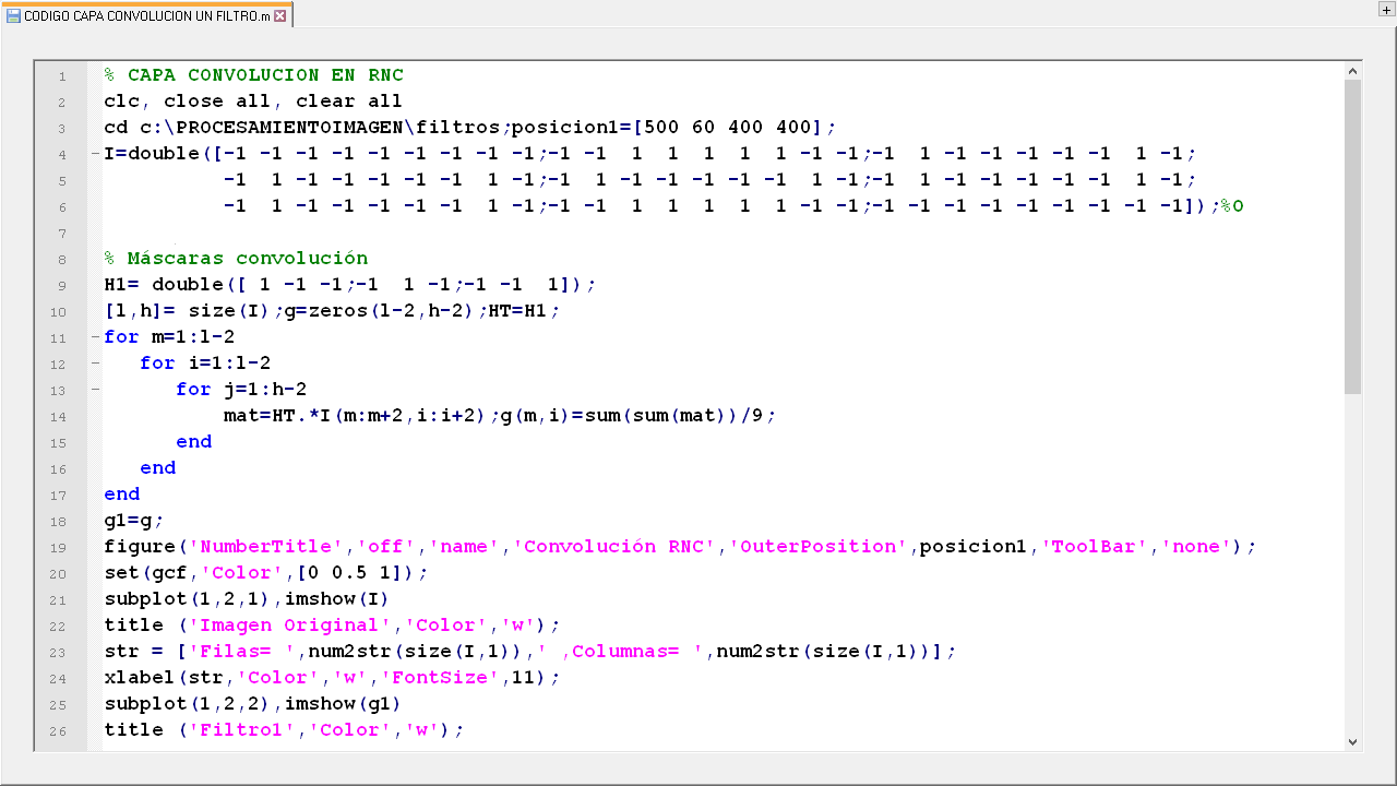 En la figura se muestra el código para calcular la matriz de la capa de convolución de un filtro.