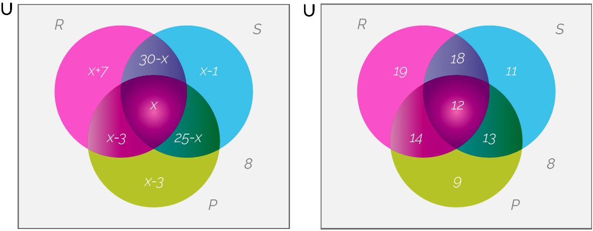 Luego a 12 estudiantes les gustan los tres tipos de música. Al sustituir el valor de x en cada una de las expresiones algebraicas del diagrama de Venn se obtiene la representación cardinal del conjunto de esta forma:
